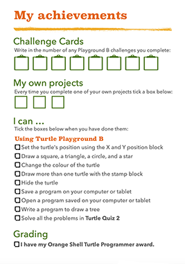 A progress chart for pupils at each grade is available that they can take with them through their Turtle adventures. In it they record their achievements and the Turtle Programming Grades they have obtained. You can download these from the resources section above.