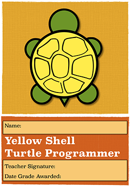 - Completed all the I can... statements in the Challenge Card they are currently using. (e.g. 9 in the Yellow Shell Turtle Programmer Grade Card, which includes solving all 4 problems in the Quiz). It is important that the teacher verifies, in some way, that the pupils can do each thing they say they can - if the next grade is to be awarded. (e.g. Pupils who are using the Yellow Shell Turtle Programmer Grade Card are working towards their Orange Shell award.)